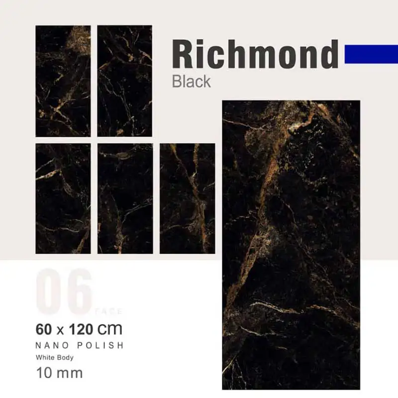 سرامیک دیوار ریچموند مشکی با ضخامت 10 میلی‌متر و سطحی صیقلی تولید می‌شود. نوع برش کالیبره آن موجب می‌شود تا هنگام نصب، درزها به حداقل برسند و سطحی کاملاً یکدست به وجود آید.